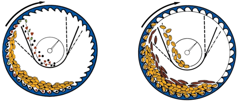 При очистке от длинных примесей происходит обратный процесс: годные семена размещаются в ячейках и выпадают в лоток, а длинные примеси выводятся сходом.