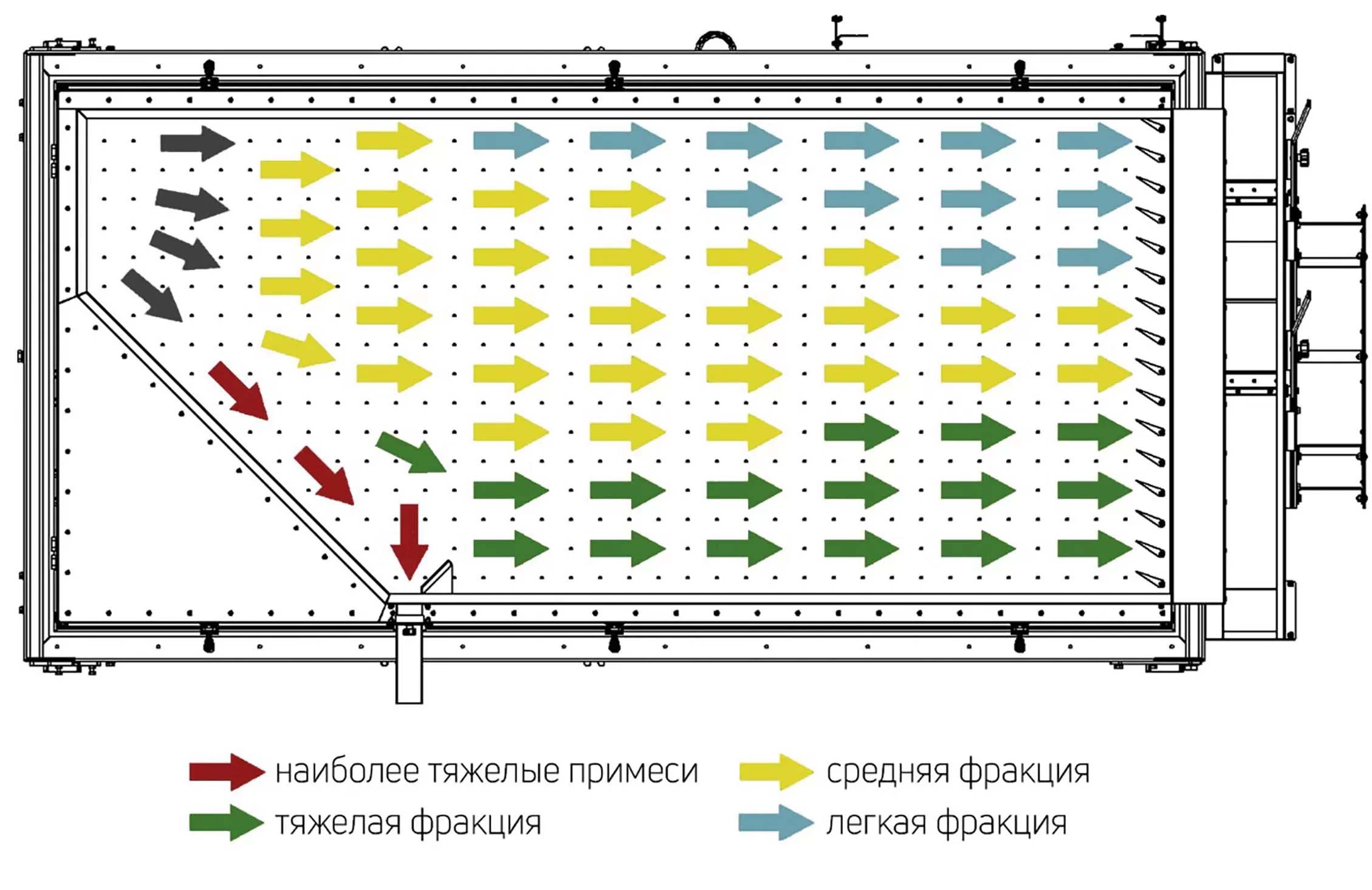 Очищаемый продукт подается равномерным слоем на поверхность стола, и за счет специального дефлектора в вентиляторе, который создает равномерный ламинарный поток воздуха, и деки стола, наклоненной в двух плоскостях, совершающей возвратно-поступательные движения, семенной материал расслаивается и переходит в псевдосжиженное состояние: тяжелая фракция опускается и перемещается вверх по направлению колебаний деки, а легковесная, наоборот, «всплывает», перемещаясь вниз по направлению колебаний деки.