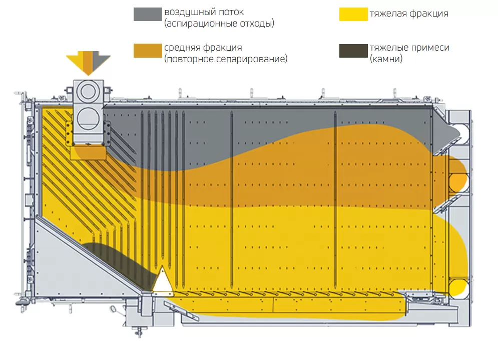 Очистка осуществляется за счет перехода продукта в псевдосжиженное состояние, при одновременном воздействии колебаний поверхности стола и воздушного потока. Очищаемый продукт расслаивается – частицы с большим удельным весом (тяжелые) опускаются на поверхность стола, а частицы с меньшим удельным весом (легкие) всплывают.