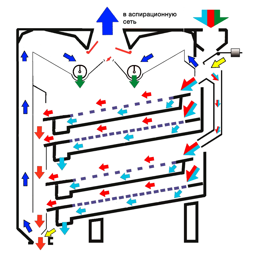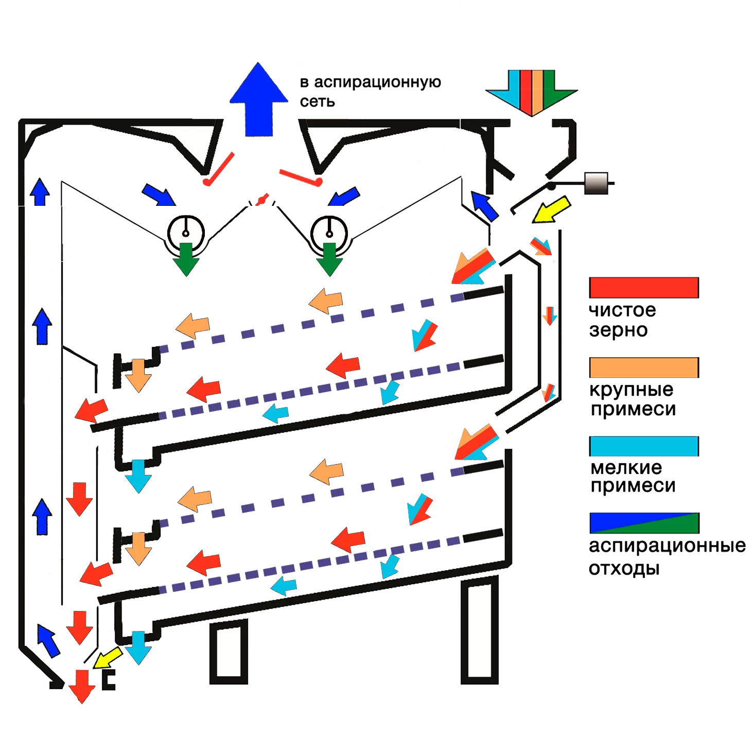 Продукт, очищенный от легкой примеси поступает на решетный стан, который состоит из одного верхнего и одного нижнего решет. Сходом верхнего сортировального решета отделяется крупная примесь, проход поступает на нижнее подсев-ное решето, на котором проходом выделяется мелкая примесь. Основной продукт идет сходом подсевного решета и попадает в канал главного пневмосепаратора, в котором продукт вторично продувается воздухом, и из него выделяются щуплые, битые зерна, легкие и другие примеси отличающиеся от основного зерна аэродинамическими свойствами.