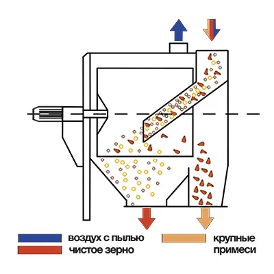 Скальператор обеспечивает прием поступающего зернового вороха, выделение крупных посторонних и соломистых примесей, путем просеивания зерна и зернобобовых культур через установленные на барабане сита. Для выделения легких примесей используется при соединенная при необходимости система аспирации скальператора.