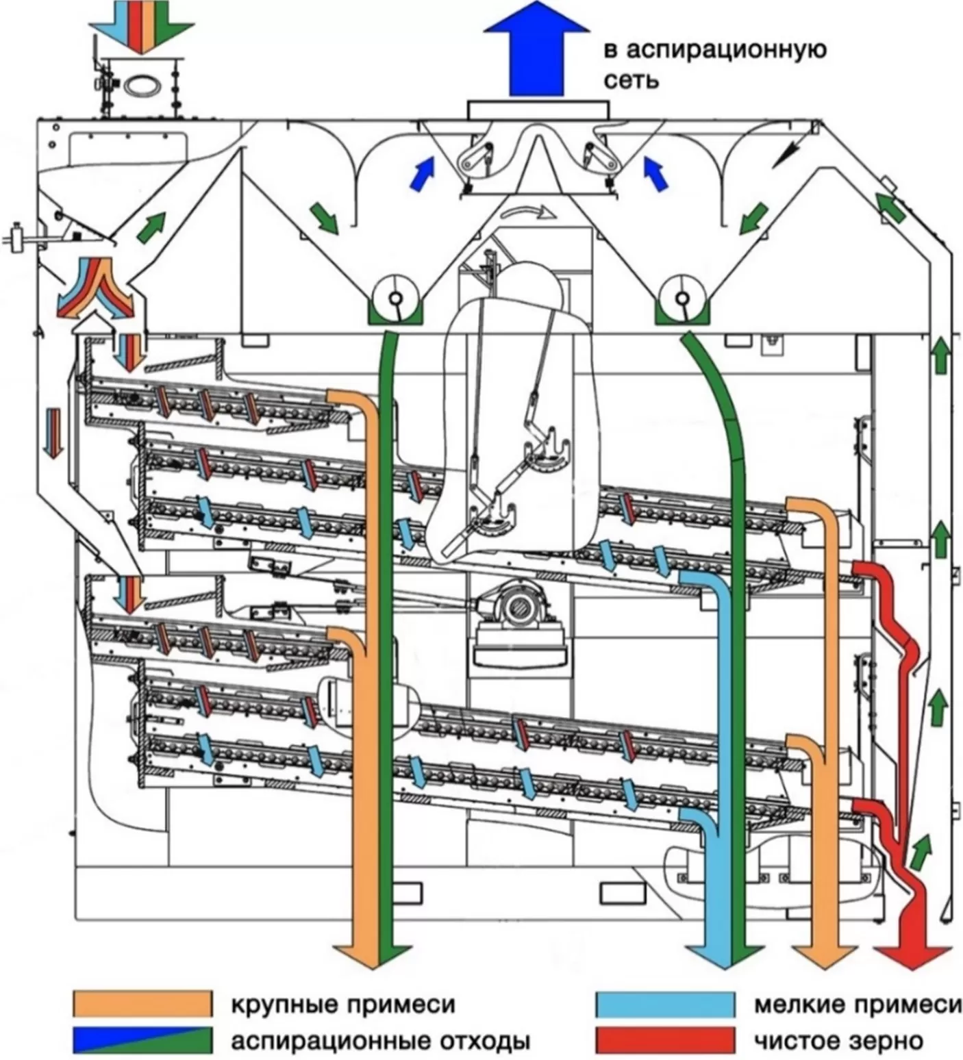 - проходом из нижних подсевных решет отделяются мелкие примеси. Основной продукт идет сходом с подсевного решета и попадает в выгрузной канал. Здесь посредством канала аспирации продукт вторично очищается воздухом и из него выделяются щуплые, битые частицы продукта, легкие и другие примеси, имеющие равные размеры с основным продуктом, но разные скорости витания.