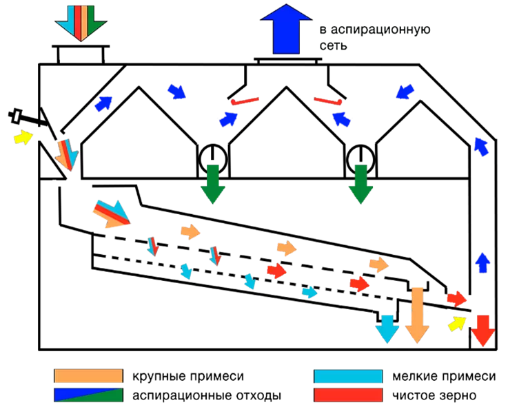 Машина оборудована одним решетным станом с двумя ярусами решет для очистки зерна от мелких и крупных примесей, аспирационной "головой" с каналами на "входе" и "выходе" зерна для очистки от пыли, легковесных примесей и щуплых зерен, оснащенной 2-мя шнеками для сбора и вывода аспирационных отходов.