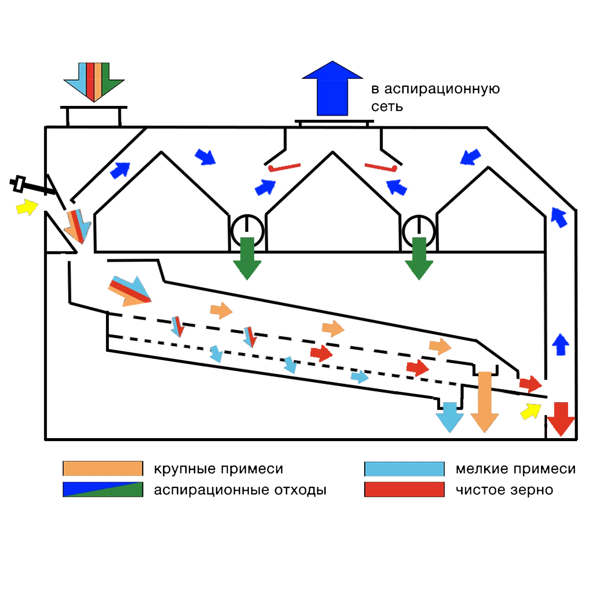 Машина оборудована одним решетным станом с двумя ярусами решет для очистки зерна от мелких и крупных примесей, аспирационной "головой" с каналами на "входе" и "выходе" зерна для очистки от пыли, легковесных примесей и щуплых зерен, оснащенной 2-мя шнеками для сбора и вывода аспирационных отходов.