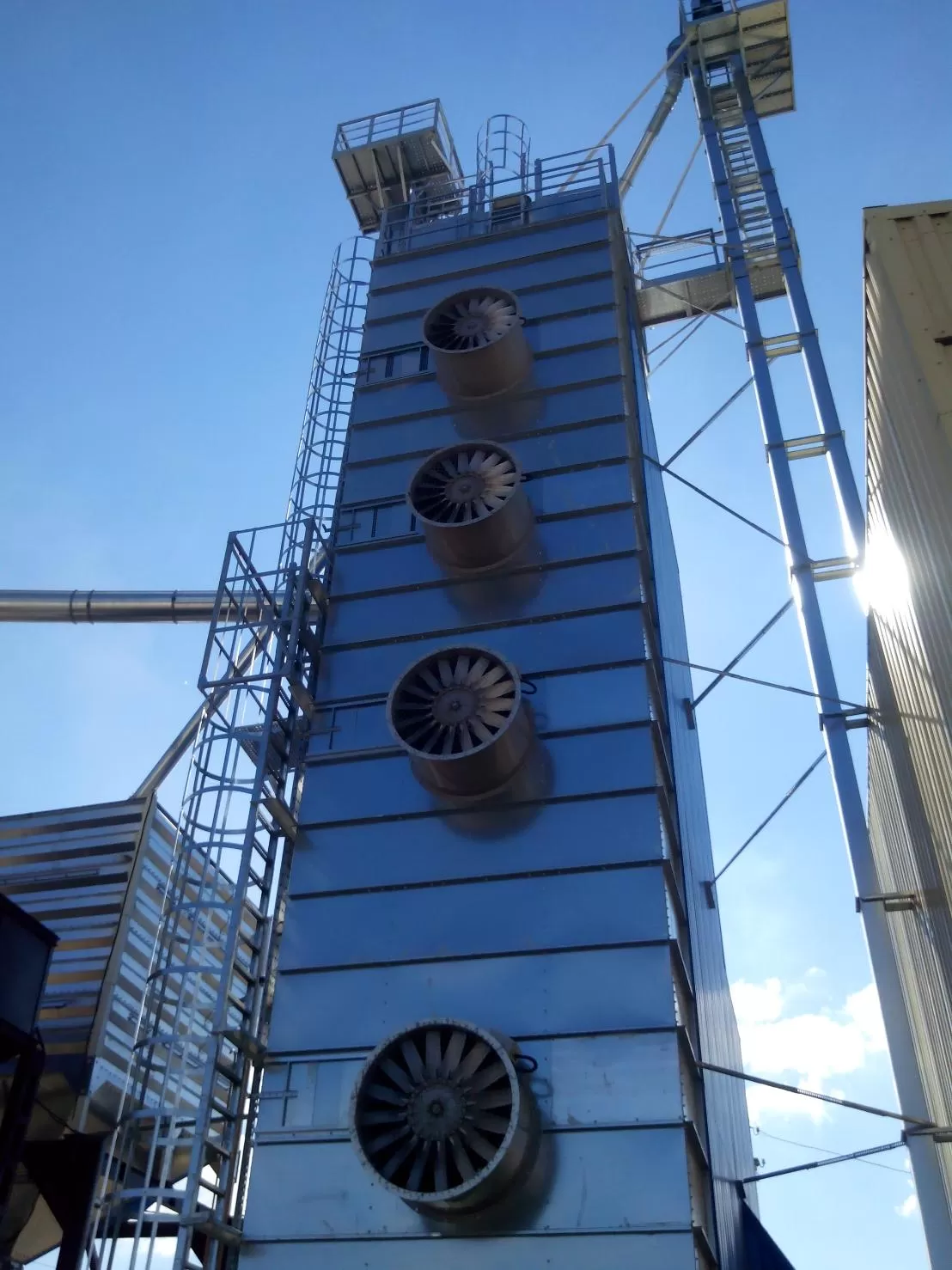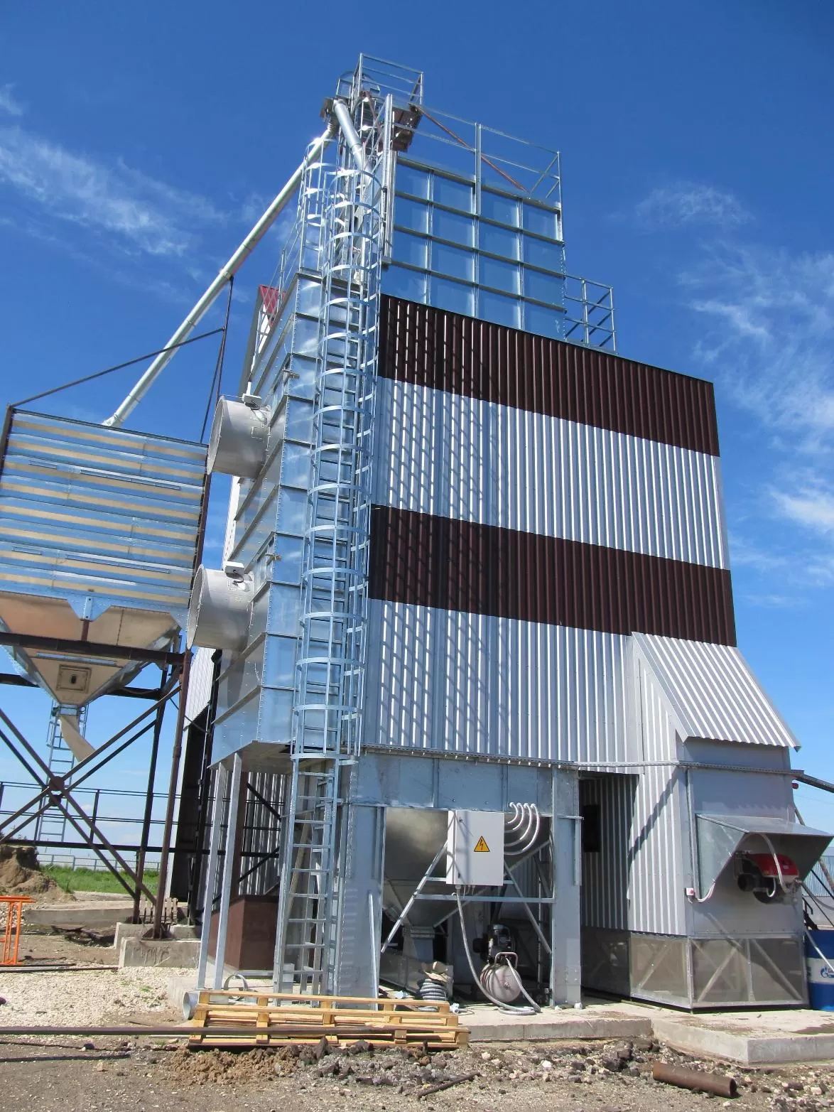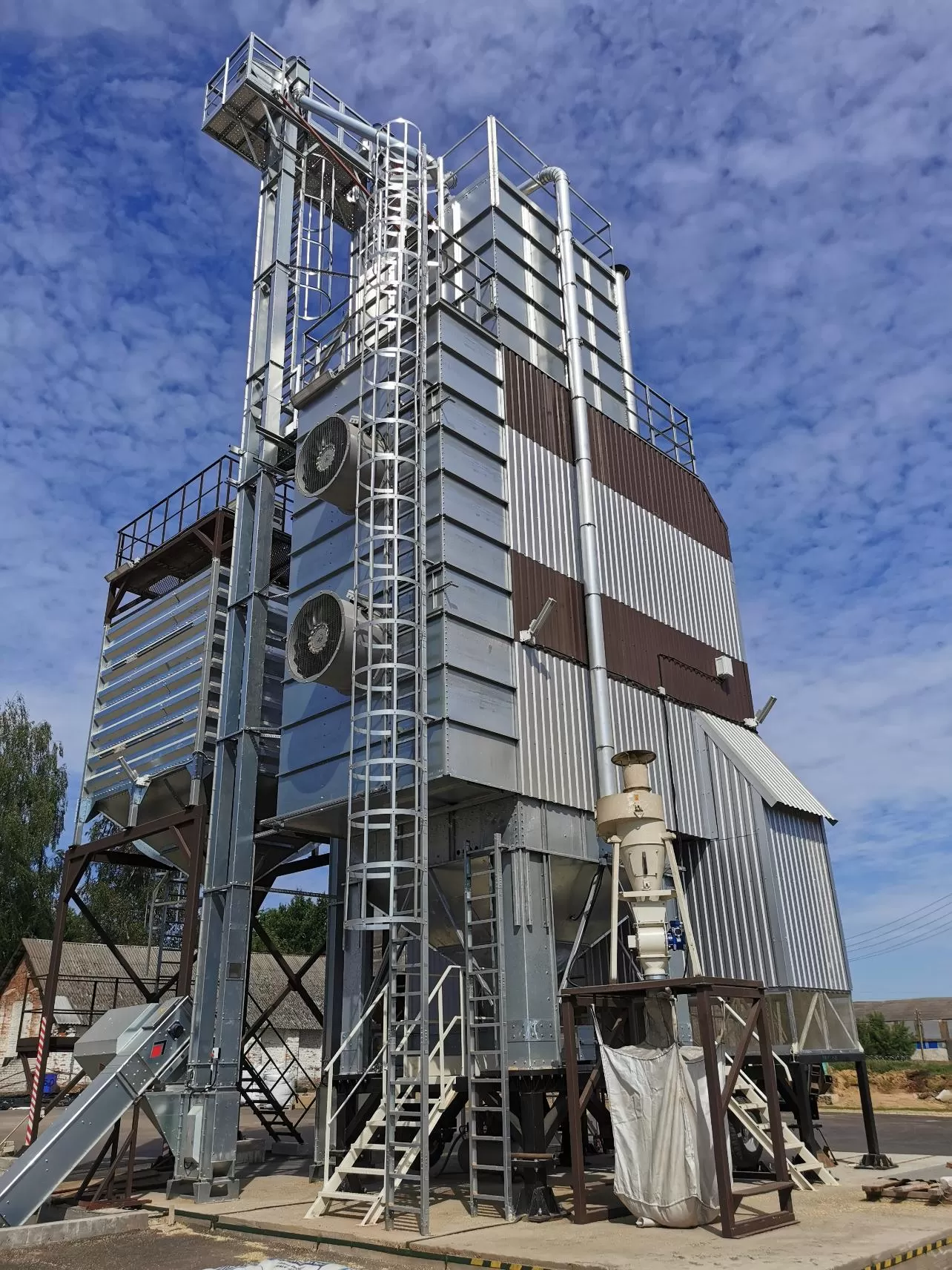 Система безопасности. Многоуровневая система безопасности зерносушилки позволяет значительно повысить пожаробезопасность зерносушилок. Система управления дает команду на электромеханический клапан отсечки подачи топлива при отсутствии электропитания, отрыве пламени от горелки или отключении одного из вентиляторов, а также при превышении предельной температуры в канале горячего воздуха, что сопровождается световой индикацией и звуковым сигналом, и благодаря чему значительно уменьшается возможность возгорания зерносушилки. Кроме этого, предусмотрена возможность быстрой разгрузки шахты.