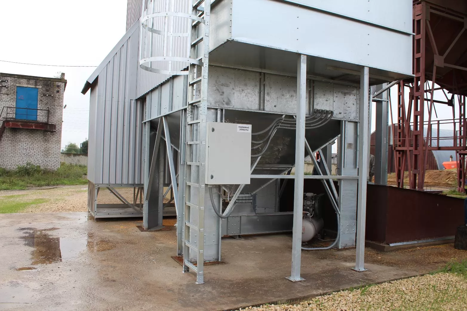 Из сушильной шахты зерно попадает в охлаждающие секции, где через него проходит холодный воздух, снижая его температуру до оптимальной отметки- на 10-15 ºС выше температуры окружающей среды. После охлаждения зерно перемещается в выгребатель, из которого через нижний бункер в выгрузной транспортер. Производительность выгрузки регулируется и устанавливается оператором так, чтобы его окончательная влажность соответствовала заданным значениям. Далее зерно подается в норию, а из нее повторно в сушилку (рециркуляция) или в бункеры для хранения.