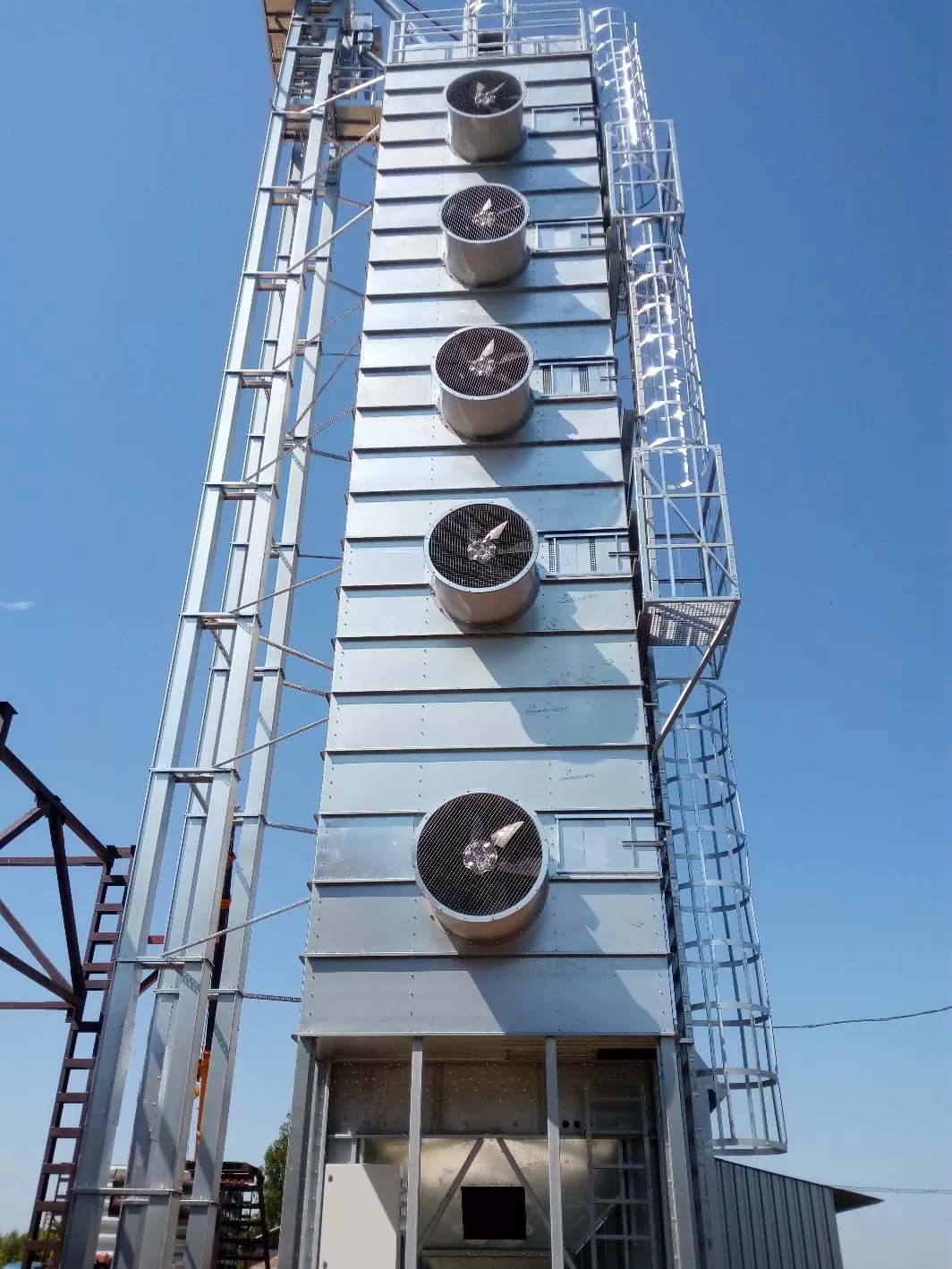 При помощи транспортного оборудования зерно загружается в зерносушилку, заполняя охлаждающие и сушильные секции и после буферную надставку, образуя в нем призму. Вытяжные вентиляторы протягивают подогретый воздух (агент сушки) через короба сушильных секций. Находящееся внутри зерно перемещается вниз, перемешивается, а агент сушки проходит между коробами. Теплый воздух, проходящий через зерно, нагревает его и забирает излишнюю влагу, после чего попадает под выпускные короба, и оттуда в шахту холодного канала, из которого выбрасывается наружу.